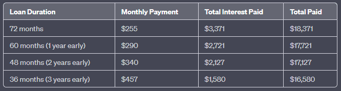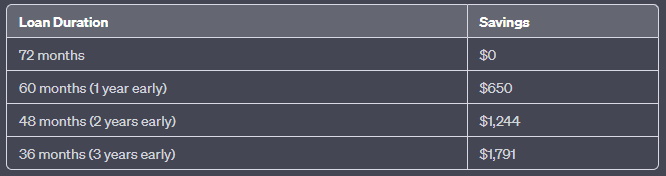 Now, to see the savings when you pay off the loan faster, you can subtract the total paid in the early repayment scenarios from the total paid if you took the full 72 months to pay off the loan. Here’s how much you’d save:
